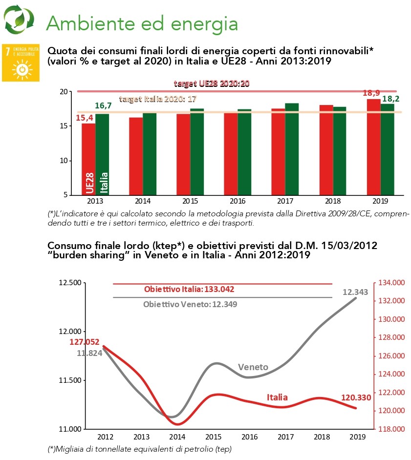 Non mancano, ovviamente, le note positive: sul tema dell’energia ad esempio dove il Veneto si appresta a raggiungere gli obiettivi europei. La Direttiva 2009/28/CE stabilisce gli obiettivi di sviluppo dell’energia da fonti rinnovabili da raggiungere entro il 2020. L’obiettivo per l’UE è raggiungere il 20% dei consumi finali di energia nei settori elettrico, termico e dei trasporti attraverso le fonti rinnovabili. Ai singoli paesi sono assegnati obiettivi individuali: per l’Italia il target è pari al 17%. Dal 2013 al 2019 l’Ue cresce dal 15,4 al 18,9%, mentre l’Italia dal 16,7 al 18,2%, valore superiore al proprio target. A seguito della Direttiva europea, in Italia, il Decreto 15 marzo 2012 del Ministero dello Sviluppo economico “Burden sharing” individua gli obiettivi al 2020 per ciascuna Regione e Provincia autonoma, ai fini del raggiungimento dell’obiettivo nazionale. In Veneto, a fronte dell’obiettivo stabilito del 10,3% di consumi finali lordi di energia coperti da fonti rinnovabili, nel 2019 l’indicatore si ferma al 16,6%. Successivamente, a seguito degli Accordi di Parigi del 2015, tra il 2018 e il 2019 la UE ha definito nuovi e più ambiziosi obiettivi in materia di energia e clima per il periodo 2021-2030 con il pacchetto legislativo “Energia pulita per tutti gli europei” – noto come Winter package o Clean energy package.