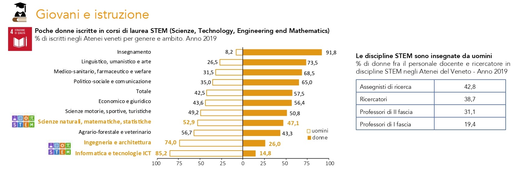 Ad esempio, uno degli obiettivi del Piano Nazionale di Resistenza e Resilienza (PNRR) è la maggiore inclusione delle donne agli studi scientifici. Lo scopo è quello di creare nella  scuola la “cultura” scientifica appositamente incentrata sull’insegnamento STEM (Scienze, Technology, Engineering end Mathematics), nella convinzione che una forte base nelle materie tecniche e scientifiche sia propedeutica alla conoscenza più applicativa degli strumenti per il digitale. Molte ancora le disparità di genere da superare. Un esempio? Su 100 studenti iscritti in corsi ICT (Information and Communication Technologies), 85 sono uomini e 15 sono donne e su 100 iscritti ad ingegneria solo 26 sono donne. Queste differenze durante il percorso universitario si traducono in percorsi lavorativi differenziati fra uomo e donna che portano i primi ad avere più possibilità di carriera e di guadagno. Considerando la fascia di età 25-34 anni, nel 2019 in Veneto il 27,4% dei laureati ha una laurea STEM: tra i maschi la percentuale è il 45%, mentre tra le femmine solo il 14,7%.