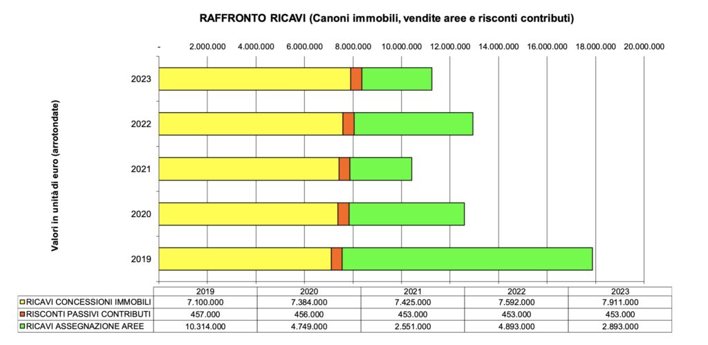 Nel 2023, il Consorzio ZAI ha registrato ricavi per € 7.911.000 derivanti dalle concessioni immobiliari, segnando un incremento del 4,20% rispetto all’anno precedente. I ricavi dalle vendite immobiliari sono stati pari a circa € 2.893.000. Tuttavia, il volume d’affari complessivo ha subito una leggera flessione, passando da € 12.639.000 del 2022 a € 12.091.000 nel 2023, principalmente a causa di una diminuzione delle vendite di aree.