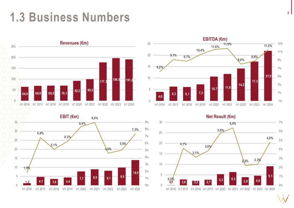 Il primo gruppo italiano quotato ha chiuso la semestrale con ricavi delle vendite per 191 milioni € (contro i 196 dello stesso periodo 2023) generati da 36,2 milioni€ di vendite Italia e 154 milioni dai mercati internazionali. In Italia a crescere è stato soprattutto il comparto horeca (più 2,43% sul 2023) e le vendite online, più 6,56%. I dati più rilevanti riguardano però la componente economica con un MOL in crescita del 27,1% a 21,9 milioni €; un risultato operativo a 14 (più 41,7%) e un risultato ante-imposte per 12,2 milioni € contro i 6,2 registrati nello stesso periodo dell’esercizio passato (più 96,6%).