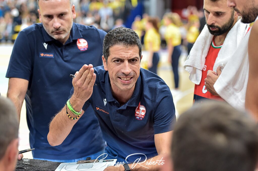 Secondo quarto: Il primo punto del periodo arriva con Liam Udom dalla linea della carità. Altro mini parziale tutto di Dada Pascolo che realizza cinque punti consecutivi. Scaligera gestisce male i falli e dopo soli tre si trova già in bonus. Buon gioco a due tra Pullen e Cannon che porta un altro 2 + 1 al centro di Allentown, PA. Verona ritorna a -1 con un tiro da tre punti di Esposito dall’ala. L’Unieuro si allontana, ma la Scaligera si riporta ad un solo punto di distacco con 5 punti trovati con Esposito e Pullen. Verona alza le percentuali dall’arco e si mantiene a contatto con i padroni di casa, guidati da coach Antimo Martino (nella foto qui sotto).