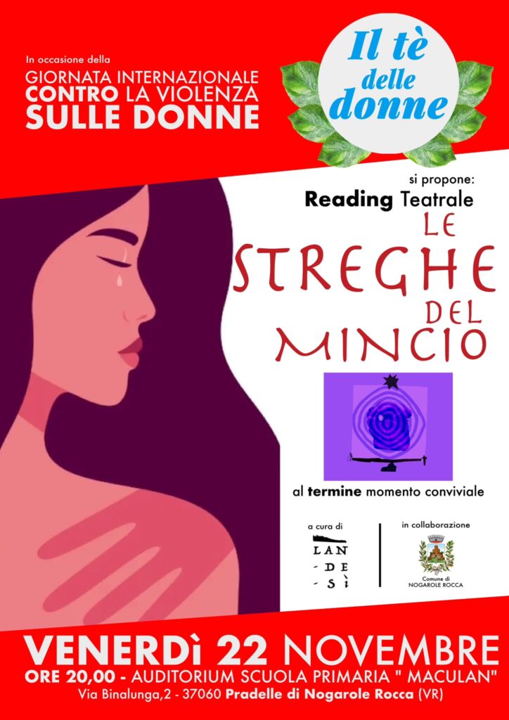 – Venerdì 22 novembre, ore 20.00: Presso l’Auditorium della Scuola Primaria di Pradelle, si terrà lo spettacolo teatrale “Le Streghe del Mincio”, una narrazione teatrale a due voci a cura del collettivo Lan-de-si Aps di Mantova, promosso dall’Associazione “Il Tè delle Donne“.