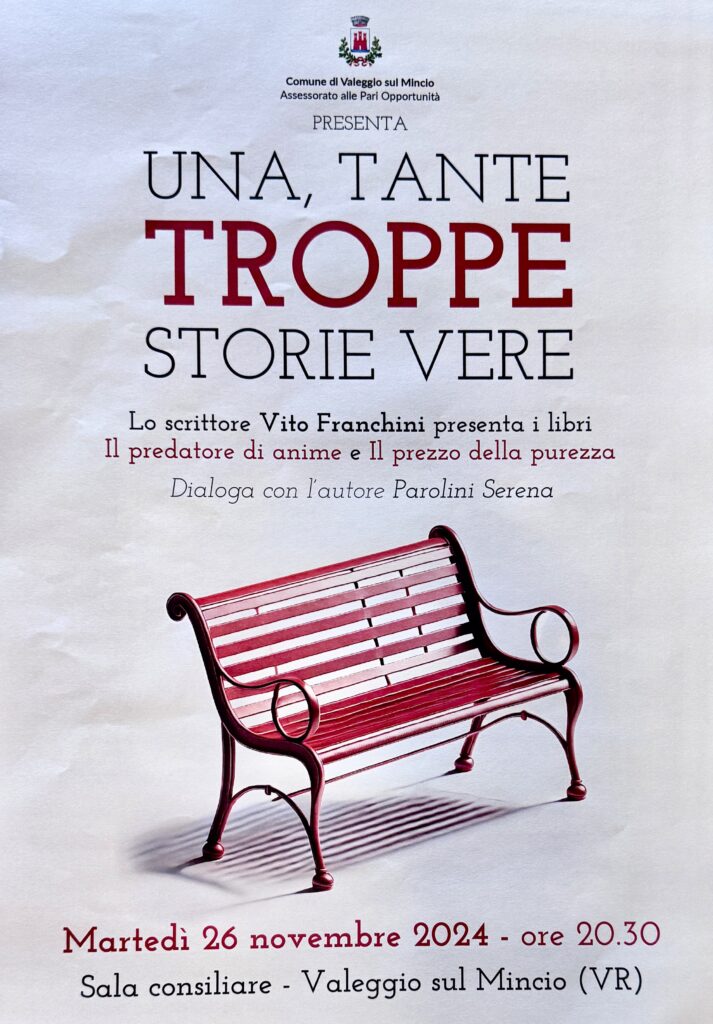 – Martedì 26 novembre, ore 20.30: In Sala Consiliare, si terrà l’incontro letterario “Una, tante, troppe storie vere”, con la partecipazione dello scrittore Vito Franchini, che presenterà i suoi libri “Il Predatore di Anime” e “Il Prezzo della Purezza“. L’autore dialogherà con la professoressa Serena Parolini.