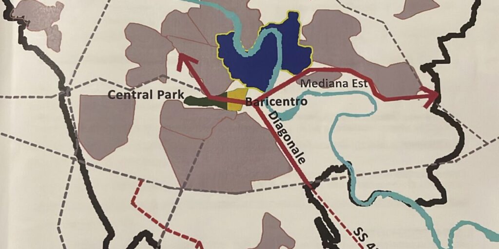 “…una strada diagonale che da Nord-Ovest tocca l’area della Stazione ferroviaria ed arriva a congiungersi con la Transpolesana-SS434 e l’individuazione di un baricentro della città con la Stazione Alta Velocità, un Polo scolastico superiore e un Polo servizi amministrativi. Passante/Traforo delle Torricelle reso ancor più urgente dagli ingombri della filovia sull’asse di via Mameli-Ca’ di Cozzi… di aprire il sistema delle connessioni fra città nord e città sud attualmente ridotte al solo e insufficiente cordone ombelicale di V.le Piave, … di qui la proposta di una Diagonale urbana che proseguendo la penetrazione in città della Transpolesana-SS.434 distribuisca i flussi provenienti da sud-est su Basso Acquar-Viale Piave-Bretella di VR nord-via Scopoli fino alle rotatorie di via S. Marco/via Curiel, servendo la Stazione dell’Alta Velocità, il nuovo polo funzionale e dei servizi denominato Baricentro e proposto con il Parco urbano denominato Central Park nell’area da dismettere delle FS… ripristinando il sottopasso ferroviario inopportunamente archiviato…”