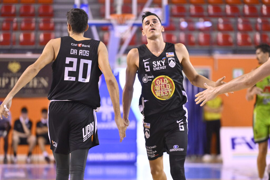 Primo quarto: La Scaligera vince la palla a due ma dopo svariati tentativi è Udine ad aprire la partita. Alibegovic fa due su tre dalla lunetta. Verona risponde subito con un floater di Zach Copeland. L’Apu accelera subito e si porta a due possessi di vantaggio. Ancora Copeland per la Scaligera che ne mette altri due. Ethan Esposito si aggiunge alla partita, realizza da tre punti e mette Verona davanti di una lunghezza. Mizra Alibegovic (nella foto qui sotto con Da Ros, per lui 100% dal campo e 21 punti a referto) realizza dalla media, ma nell’altra metà campo Leonardo Faggian subisce il fallo e fa 2/2 ai liberi. Esposito ruba palla, lancia Copeland in contropiede che la restituisce ad Esposito ed appoggia per il +3, 8 – 11 per i gialloblù.