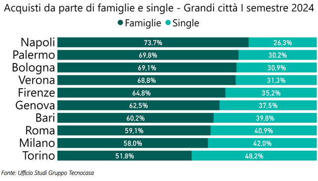 Un’analisi più dettagliata evidenzia significative differenze tra le grandi città. Napoli, Palermo, Bologna e Verona registrano le percentuali più alte di acquisti da parte di famiglie, con valori medi intorno al 70%. Seguono Firenze, Genova e Bari, dove la quota familiare oscilla tra il 60% e il 65%. Roma e Milano si collocano invece al di sotto della media nazionale, con percentuali rispettivamente del 59% e del 58%. Torino chiude la classifica con il 51,8% di compravendite effettuate da famiglie.