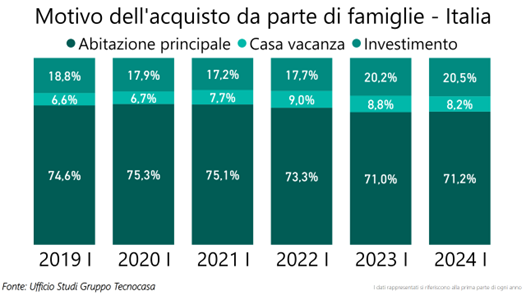 Le famiglie acquistano principalmente per soddisfare esigenze abitative primarie (71,2% dei casi). Gli acquisti a scopo di investimento si attestano al 20,5%, un valore in linea con il 2023 e influenzato dall’aumento dei tassi di inflazione. Le compravendite di case vacanza raggiungono l’8,2%, una percentuale che si mantiene stabile rispetto al primo semestre del 2023 ma significativamente più alta rispetto ai livelli pre-pandemia, quando non superava il 6,7%.
