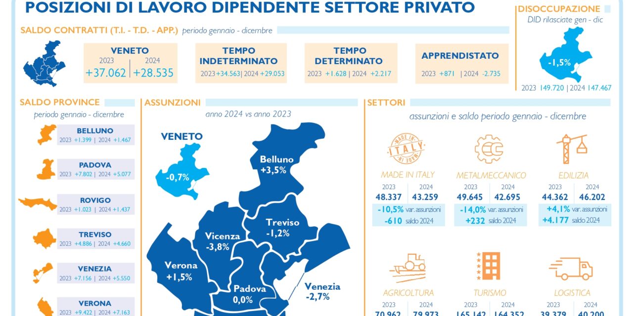 Il saldo del 2024 è positivo per tutte le province e in ridimensionamento rispetto al 2023 per la maggior parte di esse. Fanno eccezione i territori di Rovigo, con un bilancio in miglioramento, e Belluno, con il saldo cumulato sostanzialmente in linea con i risultati del 2023. La domanda di lavoro diminuisce a Venezia (-3%), Vicenza (-4%) e Treviso (-1%), mentre cresce a Belluno (+4%), Verona (+2%) e Rovigo (+2%).