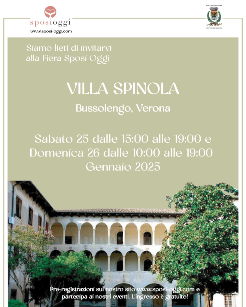 Entusiasmo per l’iniziativa traspare dalle parole del Sindaco di Bussolengo, Roberto Brizzi: “Sono molto contento che il nostro comune ospiti per la prima volta ‘Sposi Oggi’, questa bellissima fiera dedicata al mondo del matrimonio, in un luogo che, di per sé, racconta storie senza tempo: Villa Spinola. Ci stiamo avvicinando al giorno di San Valentino, nostro patrono, e non possiamo che aspettare il suo arrivo assaporando la magica atmosfera di cui si vestirà la villa.”