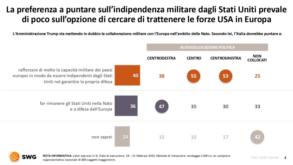 Un coinvolgimento delle forze armate italiane in una guerra o una nuova aggressione da parte della Russia a un paese europeo nei prossimi anni sono avvenimenti considerati piuttosto plausibili e il 30% non esclude lo scoppio della terza guerra mondiale. Di conseguenza, risulta prevalente, seppure di misura, la convinzione che l’Europa non debba più contare sulla protezione degli Stati Uniti, bensì rafforzare le proprie capacità militari al fine di essere in grado di difendersi da sola. Non a caso, aumenta rispetto al passato anche il sostegno all’idea della difesa comune europea.