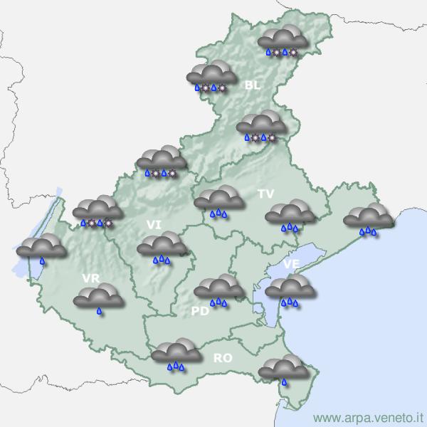 Oggi, mercoledì 26 febbraio. Fenomeni da sparsi a più spesso diffusi, con alcuni possibili rovesci e probabile culmine nelle ore diurne; quantitativi almeno in qualche caso consistenti su pianura e Prealpi; limite delle nevicate in abbassamento grossomodo da 1300-1600 m a 1000-1200 m, specie di sera.