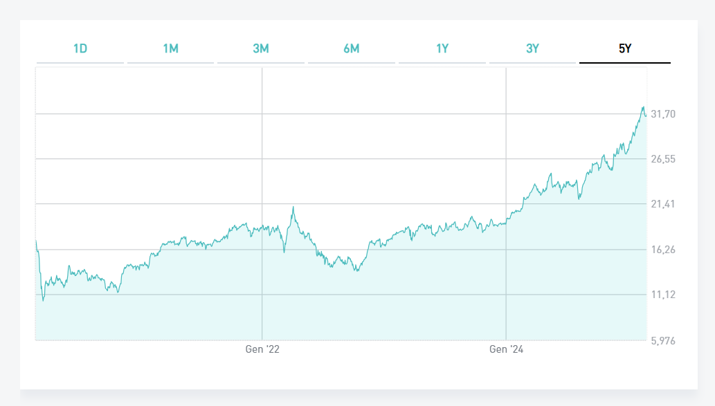 L’Ad Andrea Orcel predica a tutti che si tratta di una partecipazione finanziaria, ma in pochi gli credono. Sembra soprattutto una mossa per assicurarsi il via libera del governo e dei poteri forti che hanno anche una partecipazione importante di Unicredit sul suo obiettivo più concreto dei molti che ha messo in cantiere: il Banco Bpm (qui sopra l’andamento del titolo BPM a cinque anni) . Insomma, il 5% (che potrebbe salire al 10%) come pedina di scambio per ottenere il via libera al colpo di fusione che il governo – per bocca del viceministro Matteo Salvini e il ministro dell’economia Giancarlo Giorgetti – non vedeva con favore sventolando l’ipotesi di sbarrare la scalata col golden power.