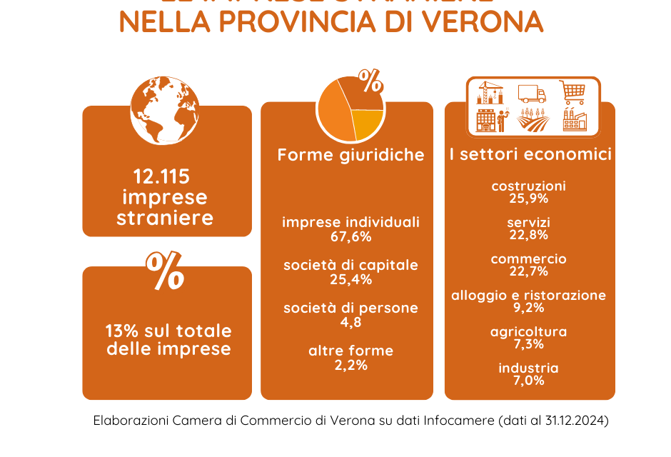 Con 12.115 aziende Verona si conferma al primo posto tra le province venete per numero di imprese straniere e seconda, dopo Venezia, per concentrazione, mentre a livello nazionale la città scaligera si posiziona al nono posto, con Milano, Roma e Torino a guidare la classifica. È l’istantanea che emerge dall’elaborazione dei dati del Registro delle imprese della Camera di Commercio di Verona al 31 dicembre 2024. Delle oltre 91mila imprese complessivamente registrate in provincia, il 13% è infatti a guida straniera, un dato superiore sia alla media regionale (12%) che a quella nazionale (11,3%). Le conduzioni internazionali registrano inoltre una crescita complessiva del 3,6% rispetto al periodo pre-pandemia, in controtendenza con quelle italiane che sul pari periodo segnano un -7,1%.