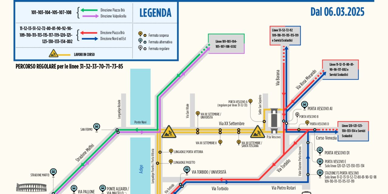 I cambi di viabilità comporteranno anche delle variazioni per il Tpl, con la definizione di nuove corsie preferenziali già tracciate durante le vacanze di carnevale e la deviazione degli itinerari da via XX Settembre su via Torbido e viale Stazione Porta Vescovo. Si ricorda che, per agevolare la mobilità, le linee provenienti dalla provincia potranno essere utilizzate per muoversi all’interno del perimetro cittadino con il biglietto a tariffa urbana.
