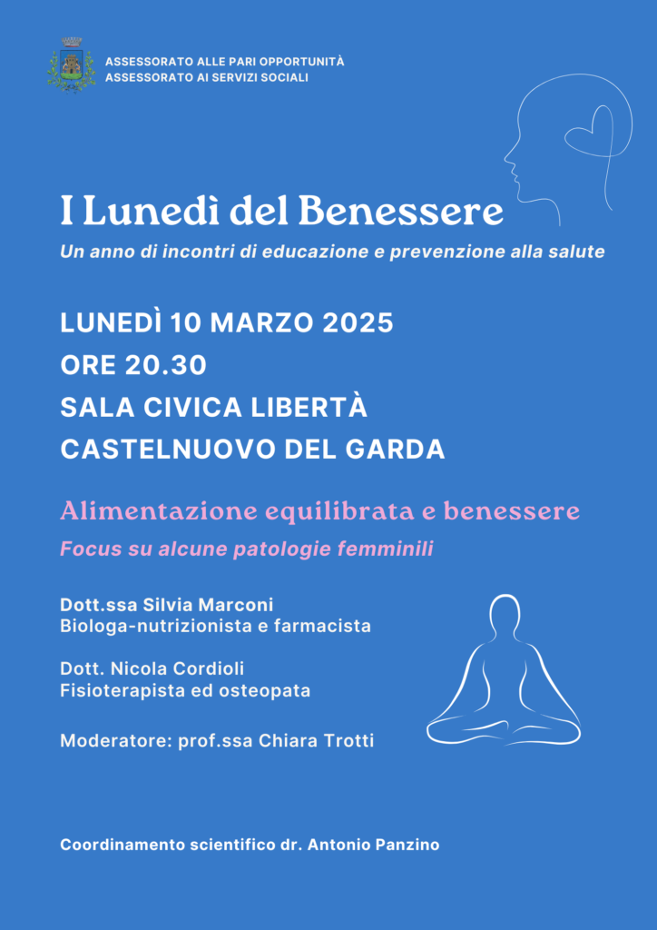 Prende il via questo lunedì 10 marzo, alle 20.30, in sala civica Libertà a Castelnuovo del Garda, “I Lunedì del Benessere” percorso promosso dagli Assessorati alle Pari opportunità e ai Servizi sociali dedicato all’educazione alla salute con il coordinamento scientifico del dottor Antonio Panzino.