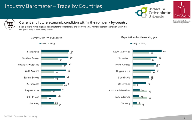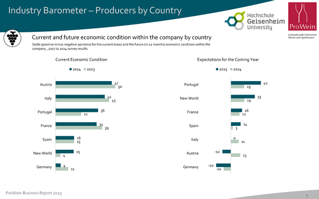 Guardando al 2025, i produttori di Portogallo, Nuovo Mondo, Spagna e Francia sono ottimisti, mentre quelli di Italia, Austria e Germania prevedono prospettive economiche meno favorevoli.