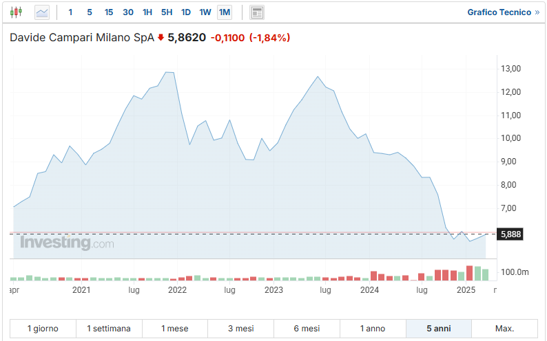 - Campari (CPR-IT): (grafico qui sopra) la multinazionale italiana, titolare di marchi come Aperol e Campari, ha registrato una flessione del titolo da €6,20 a €5,80 nelle ultime settimane, un calo del -3.88% negli ultimi tre mesi.