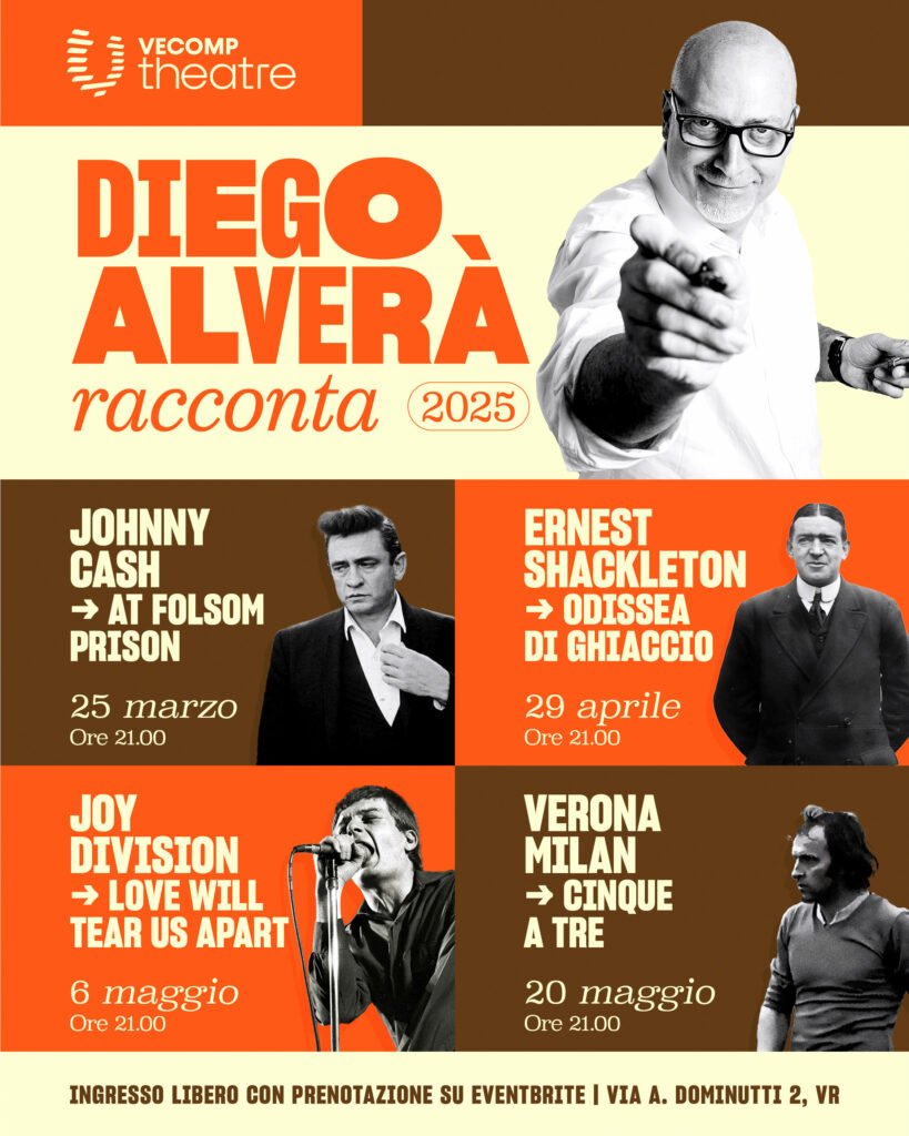 Questo il programma delle serate, che si svolgeranno sempre di martedì con inizio alle 21 al Vecomp Theatre di via Dominutti 2 a Verona. Dopo l’esordio di questa sera con “Johnny Cash/ At Folsom Prison”, il 29 aprile con “Ernest Shackleton / Odissea di ghiaccio” si apriranno spazi immensi nel biancore implacabile delle distese antartiche. Si proseguirà il 6 maggio con la storia musicale “Joy Division / Love will tear us apart”, per concludere il 20 maggio con l’entusiasmante galoppata calcistica di “Verona-Milan cinque a tre”. Tutte le serate sono a ingresso gratuito con prenotazione a questo link.