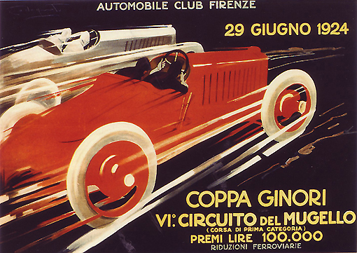 Le sue tematiche preferite, connesse al progresso meccanico, alle gare motoristiche, alla velocità ed ai nuovi mezzi di comunicazione, andarono a braccetto con l’avanguardia futurista.