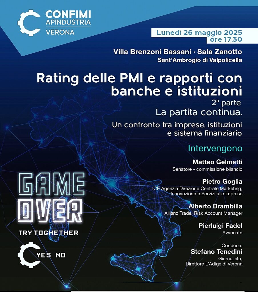 Questo quadro in continua evoluzione sarà al centro del secondo appuntamento del ciclo di incontri “Rating delle Pmi e rapporti con banche e istituzioni”, promosso da Confimi Apindustria Verona con il patrocinio di Agenzia ICE – Italian Trade & Investment Agency e del Comune di Sant’Ambrogio di Valpolicella. Dopo l’evento di Illasi, che ha aperto la rassegna (a questo link), la nuova iniziativa è in programma lunedì 26 maggio alle 17.30 nella Sala Zanotto in Villa Brenzoni Bassani, a Sant’Ambrogio di Valpolicella.