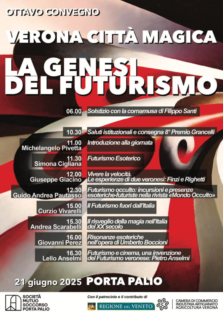 (A. Paratico) Una serie di eventi culturali si terrà dentro la monumentale Porta Palio il 21 giugno organizzata dalla Società di Mutuo Soccorso che organizza da 8 anni Verona Magica. Si parlerà di Futurismo, il movimento artistico, politico e culturale, ideato da Filippo Tommaso Marinetti che poi si diffuse in tutto il mondo. Nella giornata di sabato venturo si indagheranno certi aspetti poco noti e poco studiati di questo Grande Movimento, in particolare certi suoi risvolti mistici e magici. Il luogo si presta moltissimo a questi temi, essendo, forse, infestato da fantasmi e spiriti inquieti.