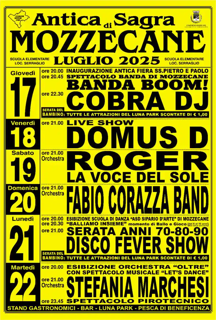 Con il taglio del nastro, fissato per giovedì 17 alle ore 20, si darà il via all’edizione 2025 che proseguirà alle 20.45, con lo spettacolo della banda paesana “Banda Boom!”. Venerdì 18, dalle 21 serata dance per giovani con il dj villafranchese “Domus D”. Sabato 19 (alle ore 20 Stefania Vesciarelli e Serena Perobelli di “Planet Fitness” anticiperanno la serata con “Balla con Noi”) e domenica 20 le serate (dalle 21) saranno animate da due orchestre: Roger “La voce del sole” il sabato mentre domenica Fabio Corazza band. Il clou sarà lunedì 21 con l’esibizione, alle ore 20, della scuola di danza paesana “Asd Sipario d’arte”; alle ore 20.30 spazio a giochi e balli per bambini dai 6 ai 10 anni con “Balliamo Insieme”e alle 21 serata anni 70-80-90 con Disco Fever Show. Si chiuderà l’Antica Sagra martedì 22 con, alle ore 20, l’esibizione dell’orchestra “Oltre” con spettacolo musicale “Let’s Dance”. Alle 21 l’orchestra Stefania Marchesi accompagnerà la serata fino allo spettacolo pirotecnico, fissato per le 23.45.