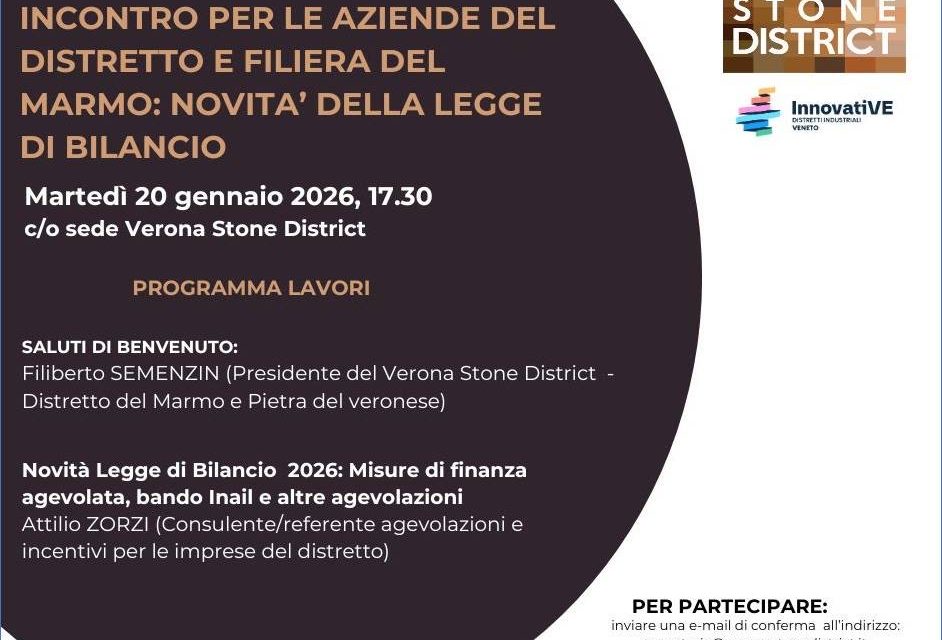 Si è svolto lunedì 20 gennaio, presso la sede del Distretto del Marmo, l’importante convegno “Le Agevolazioni per le imprese del 2026“, organizzato dal Verona Stone District in collaborazione con il Consorzio Marmisti della Valpantena, Confimi Apindustria Verona e AS.MA.VE – Consorzio Marmisti Veronesi.