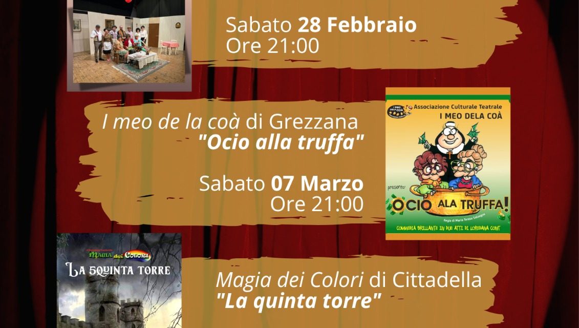 Si partirà sabato 28 febbraio alle ore 21 con la compagnia teatrale “Magia dei Colori” di Cittadella che presenterà una commedia di Camillo Vittici dal titolo “Smemorate ma non sceme” in dialetto veneto. Si passerà poi a sabato 7 marzo, sempre alle ore 21, con la compagnia “I meo della Coà” di Grezzana che presenterà una commedia di Loredana Cont, in dialetto veneto, intitolata “Ocio alla truffa”. Il sabato sera successivo Povegliano vivrà la 56ª sfilata di carnevale e il giorno successivo, domenica 15 Marzo, alle ore 16 sempre “Magia dei Colori” metterà in scena una favola teatrale di Massimo Begnoni, “La Quinta Torre”, uno spettacolo adatto a bambini e ragazzi.